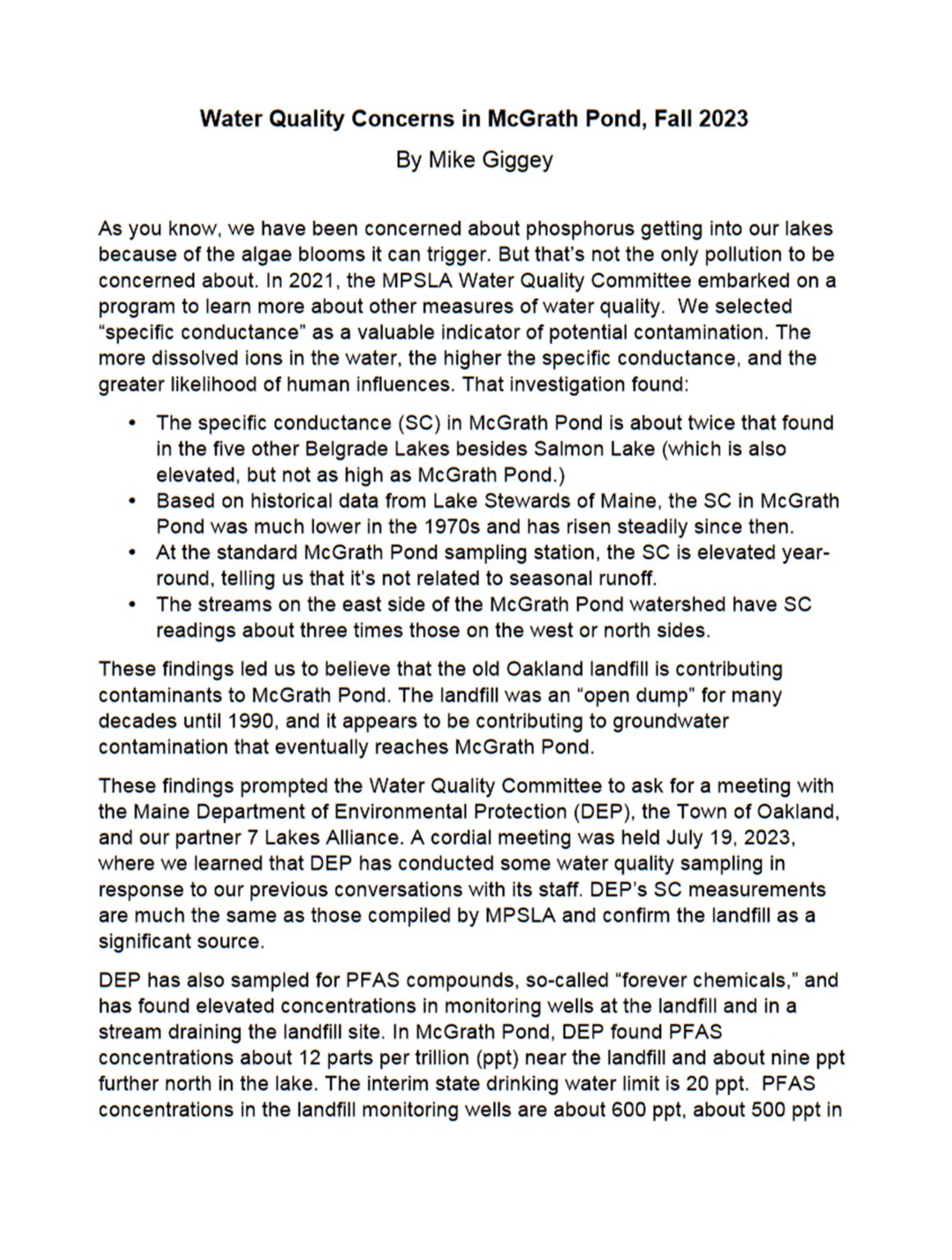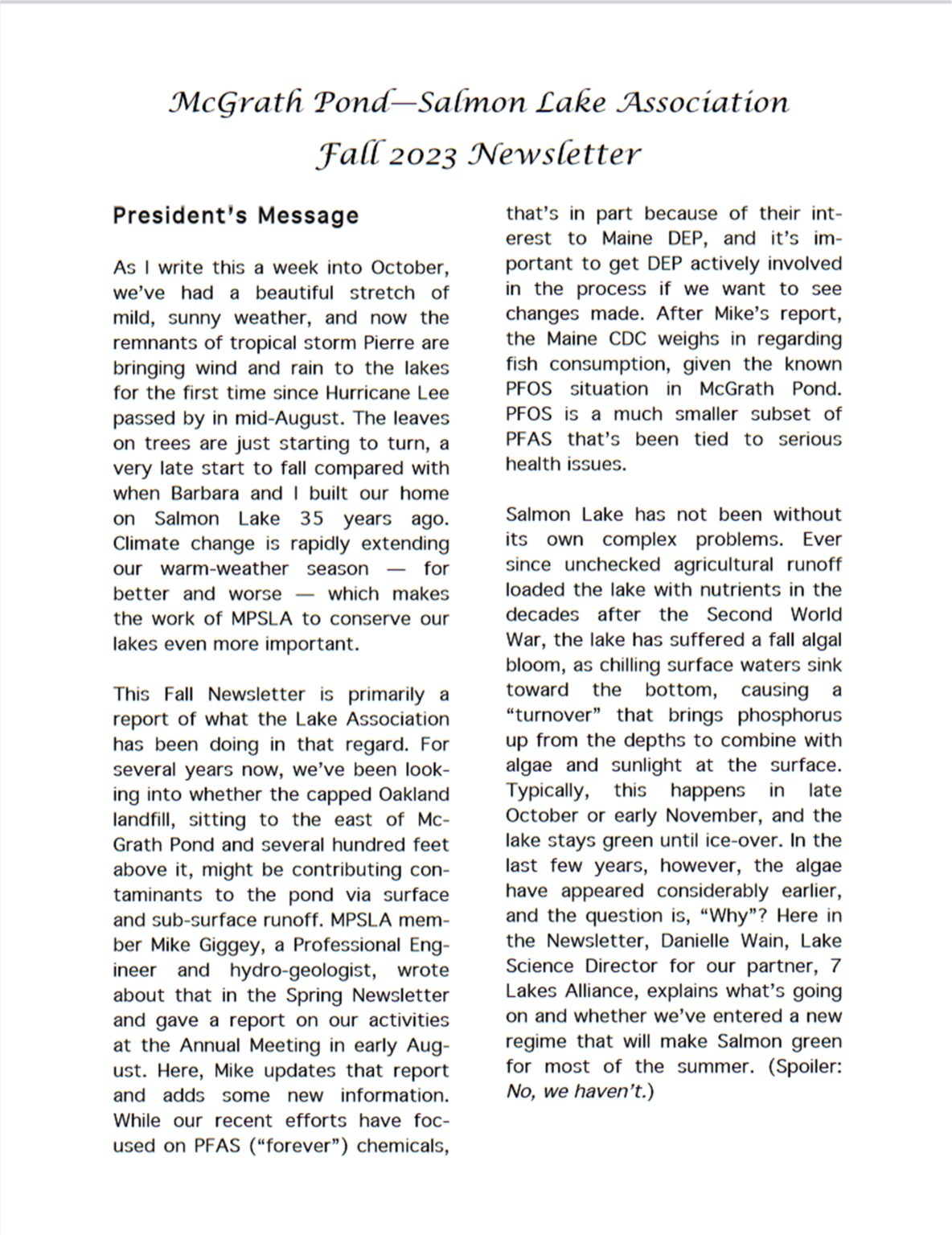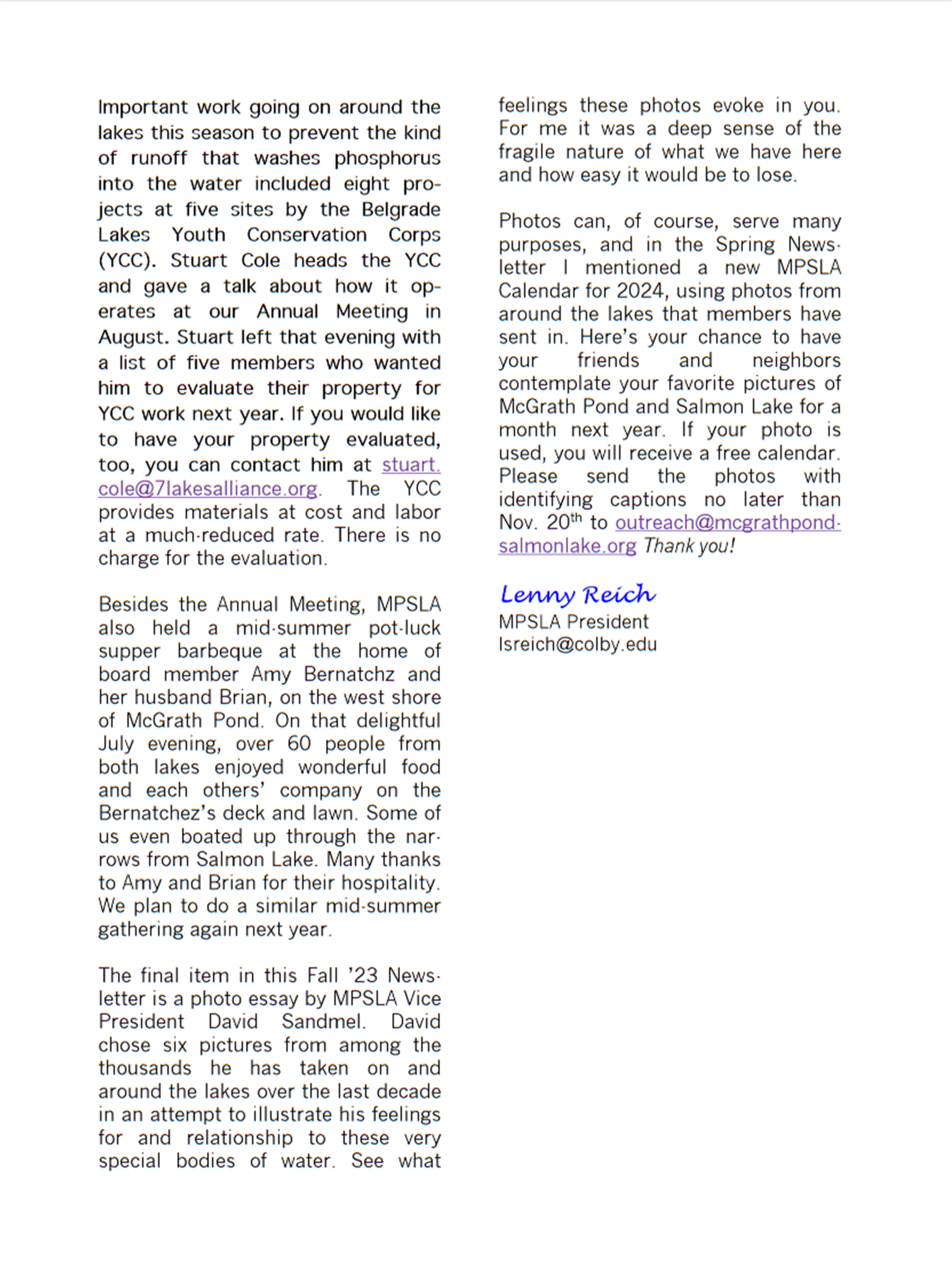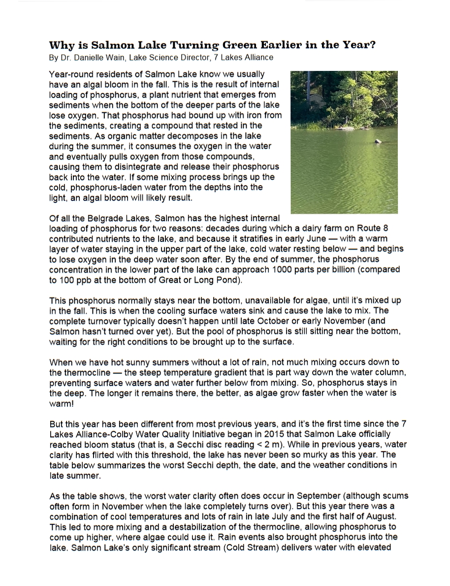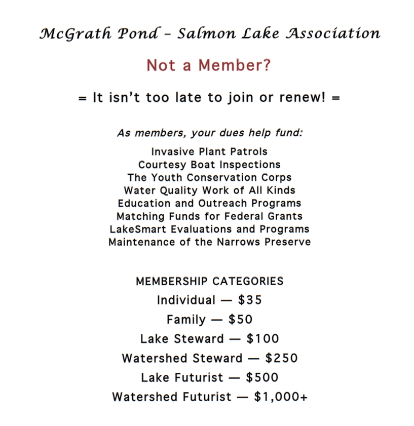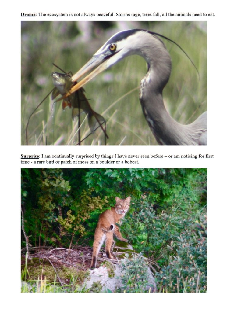 I’ve been coming to McGrath Pond and Salmon Lake my entire life. My mother, Frances Fox Sandmel, and my grandmother, Hortense Langsdorf Fox, adored the lakes and the woods. They could identify many of the flora and fauna we encountered, and taught me reverence for the natural world. I also love the lakes – especially exploring them in a kayak, which allows me to go slow and observe closely. I take most of my pictures from the kayak.