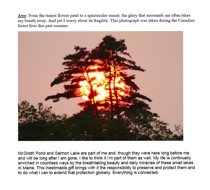 I’ve been coming to McGrath Pond and Salmon Lake my entire life. My mother, Frances Fox Sandmel, and my grandmother, Hortense Langsdorf Fox, adored the lakes and the woods. They could identify many of the flora and fauna we encountered, and taught me reverence for the natural world. I also love the lakes – especially exploring them in a kayak, which allows me to go slow and observe closely. I take most of my pictures from the kayak.